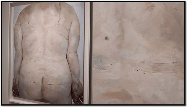The second ‘fold’ is that each mark, or repertoire of marks within a pattern when the stressor make itself sensed thus on a body, is actually also independent of its representational role and valuable in terms of signalling effects entirely aesthetic or inwardly reflexive about the process of creation by painting. Each becomes the means of articulating outwardly the way marks are independently made on the painting’s canvas or relative to each other (they can be simple relations like contiguity, overlap or overpainting) to create the patterning of various variations of painting technique in its passages of paint. These effects are those of art and perhaps have their own anatomy, one that can be indicated by the way the body can be conceived as a marked subject-matter, bearing the burden of its many experiences.