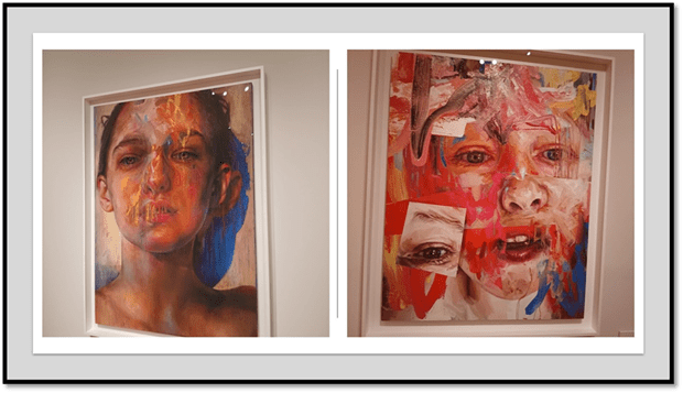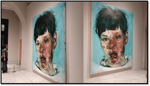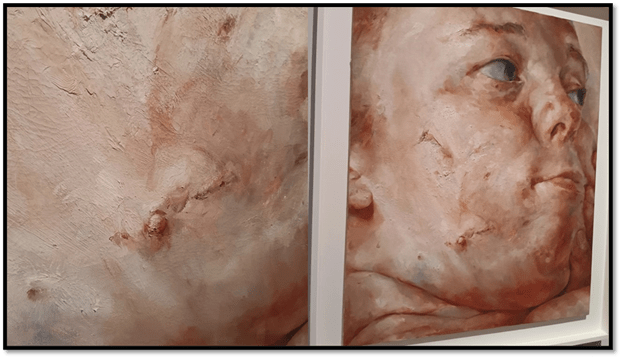 Marks on the body related to multiple life-stressors involved in their production also have a kind of relationship to their designed production in paint. Some are hard-to-explain naturall productions of diversity in internal body regulation, other are historical wounds and scars. Sometimes those life-stressors appear to take precedent, when the figure’s vulnerability is presumed. This can be done with what might be exclusively female figures, although the exclusivity is deeply uncertain, an issue we are told in the catalogue was derived from Saville’s reflection on female experience and its representations from the study of the feminist deep thinker, Luce Irigaray, who she quotes – in text in ‘mirror-reversal, over the surface of Propped. But, be that as it may, I think what Andrea Karnes says in her catalogue essay on the deep influences of Willem de Kooning as a painting practitioner very telling other method as requiring that sex/gender is often difficult to read, working – like the Stare heads Karnes is discussing – from models that are not an ‘archetype of womanhood’ as in De Kooning but that of a ‘specific individual’ where sex/gender markers can be – and very often are unaided by artifice – non-binary in terms of sex/gender. Individuals favoured by Saville, Karnes says are boundary being – sharing both traits of the modern ‘normal’ and the pathological (or evidential as in crime mugshots), life and death and querying ‘the constitution of femaleness itself’; The heads ‘may or may not be a woman: the figure is androgynous’.[6] In that light look at some pictures that often most disturb because they record the mark-making of past human violence in the studied marks of the artistic process.
