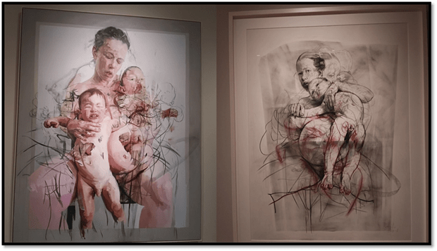 In fact drawing and painting are used to overwrite the sense of the fusion of body boundaries Saville experienced in childbirth – her over-drawings of oil often leaving a chaotic commentary over images mixed up of struggle and less achieved moments of peace, something she sought to turn to art by looking to, and critically unpacking in visual ways, classic mother-and-child imagery in Renaissance art: