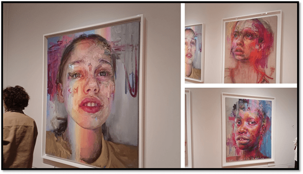 Those heads are still severed, colour marks past experience of differing significance and range of meaning to the person or us. The heads can float like the severed one of Orpheus in the artist’s songs of colour but they still dissect the head back into what constitutes it – as human or art object. It still streams – with tears or blood but is more intensely pleasurable because of its colore painterliness, in the language of academic art. And much is done with technique that has signification in other registers of discourse – erasure, inversion, fragmentation and partializing for instance.