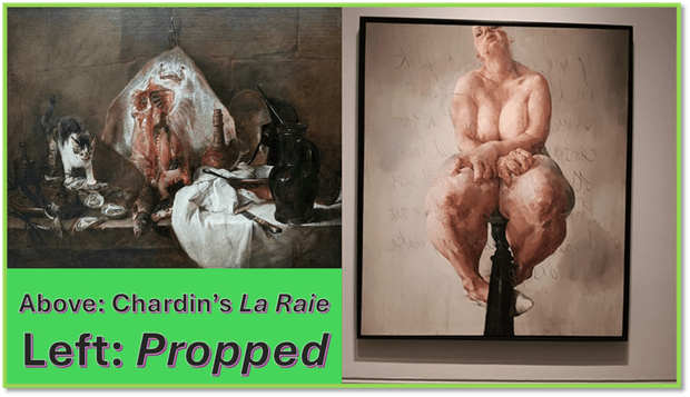 Perhaps, in the catalogue, John Elderfield, expresses it in comparing Saville’s Propped (1992) with Chardin’s La Raie ([The Skate] 1725 – 6 ) in the words of Denis Diderot: it was “a disgusting, repugnant picture” but was also a pleasurable demonstration of how to “salvage objects through sheer talent”, which he sums up in his own words thus, saying that the perspective (bottom -up) puts the viewer in a ‘position, where the picture, as an imitation, may be painful to see, while the painting of it, if not quite pleasurable to see, is so extremely compelling of our attention that we do not want to look away’.[4]