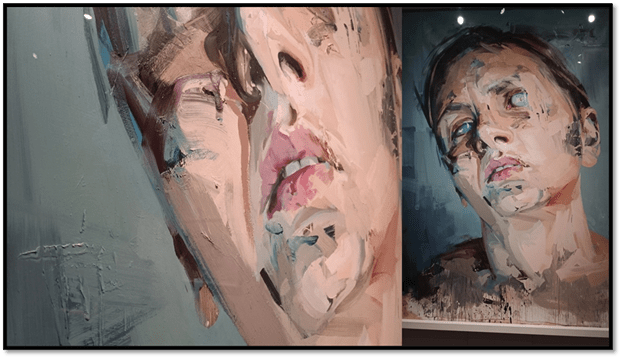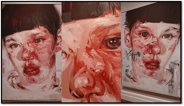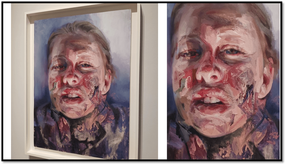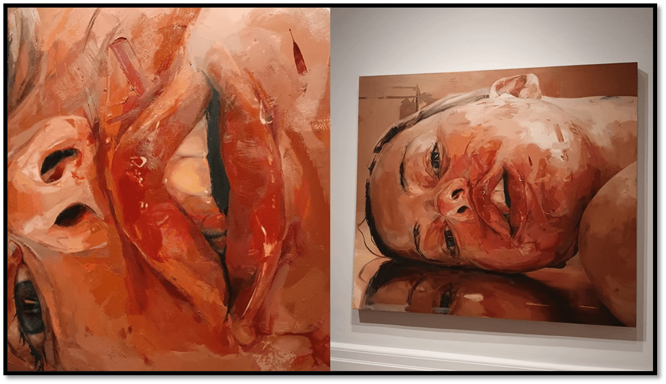 Shadow Head is so ambiguous – their eyes alive, if, on the right stained by shadow, stain or bruising, in the near abstract forms used to refashion their pained right cheek and the abstract work below and around the neck offering the head, as if it were a forensic specimen severed at that place. Pain, pleasure, beauty and something non beautiful. Here is an example where the lips invite you not only to touch but kiss, and yet what ambivalence that creates in a viewer. Bleach is not less so – but is it called that to explain the vary-toning of the hair or the ‘damage’ on the face – the flattened nasal structure too not only being an ambiguous sex-marker but standing between nature and violence.. Yet for Saville, as must be the case, making these form details are also part of painting / sculptural process. She says to Sarah Howgate: