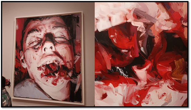 In such situations, at one level the consequences of marks upon the body become one akin to forensic, the ‘victim’ being uncertainly living and perhaps dead. And more shockingly, the effects of violence become prompts to a kind of appeal, that disturbs the viewer. Although in both cases the pull is defended at the level of technique where in the brilliant (and huge – see the departing gallery viewer by its side) Witness (2009), the face is pulled apart – in death or a record from the life – by the painting falling into abstraction. Indeed often, in building these heads, Saville says she starts from decisively being able ‘to drive bright green or yellow oil bar right through the structure of a head, and build the flesh around that’.[8] In witness the violence is not of driving a bar into the head but from excavating red from the figure’s interior through cutting up an orifice. The paint literally screams beautifully.
