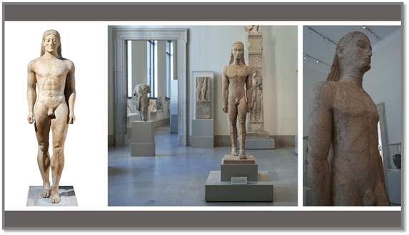 Moreover, such a reinterpretation of what we and Patrick have already read must (in, perhaps the write up of the narrator’s notes that is the current novel) , he says, sacrifice some of its currently narrated elements, especially the narrator’s connection with the ‘hot body’ of the character, Niko, at a point in the middle of all of the collected stories we read, and ‘spin some tighter stories’ with a defined ‘narrative torque’ around the hallowed ‘theme of the father’, currently ‘semi-submerged’ in the text (he says). As always and with other men in the novel, like Petros, for instance (or Petros / Stephen if we decide these are one as Patrick does), she gives way to male authority immediately, saying that: ‘Niko is a minor character in the theatre of my memory’.[1] But just because she comes to that decision does not mean that the reader may not feel mislead into a reduction of the narrative’s potentialities towards alternate forms: such as that she muses upon after four nights of sex with Niko: ‘Begin and end with the beauty of Niko’.[2] For the beauty of the ‘kouros’ may be an end in itself, requiring no justification and self-completing without extension as a necessary and sufficient example of the love of a generalised humankind.