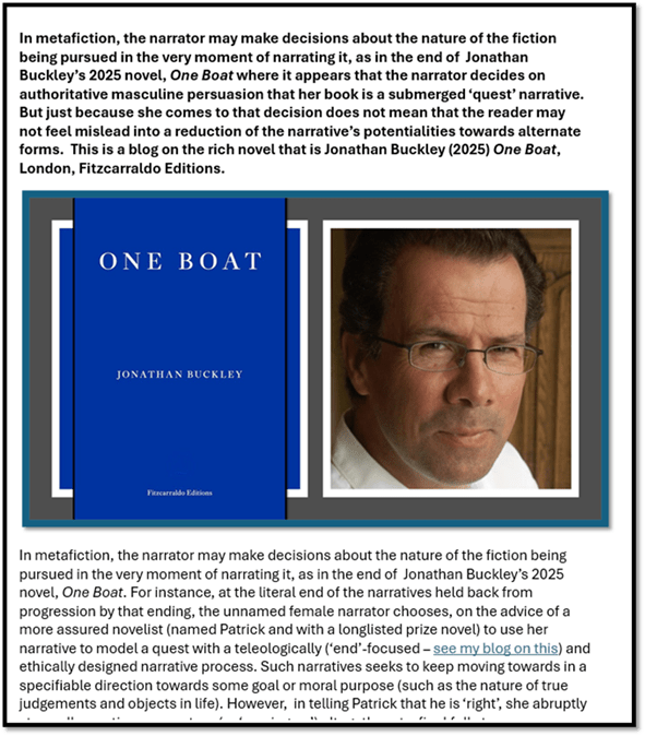 In metafiction, the narrator may make ad-hoc decisions about the nature of the fiction being consciously adopted in the very moment of narrating that fiction, as in the end of Jonathan Buckley’s 2025 novel, One Boat where it appears that the narrator decides on authoritative masculine persuasion that her book is a submerged ‘quest’ narrative. For instance, at the literal end of the narratives held back from progression by that ending, the unnamed female narrator chooses, on the advice of a more assured novelist (named Patrick and with a longlisted prize novel) to use her narrative to model a quest with a teleologically (‘end’-focused – see my blog on this) and ethically designed narrative process. Such narratives seeks to keep moving towards in a specifiable direction towards some goal or moral purpose (such as the nature of true judgements and objects in life). However, in telling Patrick that he is ‘right’, she abruptly stops all narrative momentum (or ‘moving on’) altogether at a final full stop. Just because she comes to that decision does not mean that the reader may not feel mislead into a reduction of the narrative’s potentialities towards alternate forms or that the novel actually changes in any way for the reader.