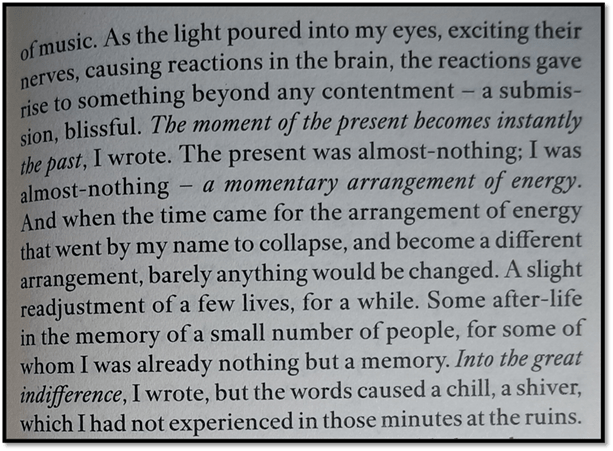 Those terms are from the jargon of socio-cognitive psychology, where scripts are schematic of generalised interactions described by theatrical metaphors that guide human life and the various repertoire of limited ‘speech acts’ therein available. Amongst these ‘speech acts’, the mind can ‘slip into another scene, a generic scene rather than one particular moment’, which psychologists describe as the characteristic of episodic memory, where events are categorised into schematic scripts, leading to memorial confusions in terms of memories located in specific times and places, but also to a sense of predictability and déjà vu.[8] Yet these terms are also complicated by the representation by the narrator as the scribe of what she sees and hears and perhaps not only a scribe but a translator who reinvents a scene in her own terms, such that the source of the melancholy and its wane are unclear – they are attributed to the scene but they also arise, we are told, from the translator of the scene and integrate therewith.