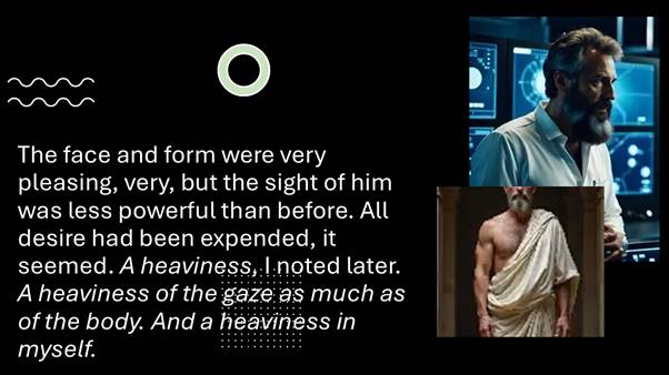 The face and form were very pleasing, very, but the sight of him was less powerful than before. All desire had been expended, it seemed. A heaviness, I noted later. A heaviness of the gaze as much as of the body. And a heaviness in myself.