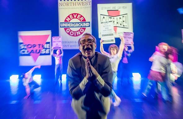 Special notice needs to be given to the local community performers, for this gave the piece an authenticity that the skills of the professional performers sometimes hides under the naturalised artifice of good enactment of the body expressing itself in various non-spoken forms. The were particularly well used to do some really wonderful tush-shaking with the message of Section 28 worn on their bum cheeks like the metaphoric legal toilet paper it was. The local cast below though was that for the Manchester production – I would stand tall in honour however of the Newcastle cast too.