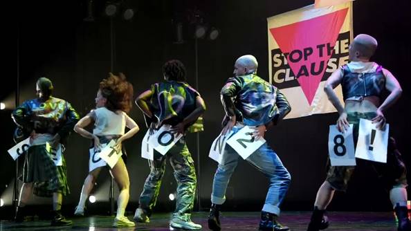 However, the central sections of the drama showed dance movement of extraordinary joy that was spontaneously applauded by the largely young audience of queer people and allies, for these sections dealt with the fightback to the introduction of Section 28 to the Local Government Bill, its enactment and the nine year period of its stay on the Statute books. The play’s publicity tells of this joyful section – set against the placards of the period created in resistance to the clause: