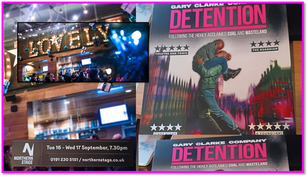 The publicity told us that ‘Detention is a powerful new dance theatre show at Northern Stage’, a theatre embedded in the campus of Newcastle University and with that ‘LOVELY’ bar space pictured in the collage above, ‘exploring the impact of Section 28’ of the Local Government Act of 1988 ‘on the LGBT+ community through exceptional choreography and storytelling’. Every quoted word here tells the truth. The choreography and storytelling was indeed ‘exceptional;’ but also emotionally and viscerally accurate (and oh so viscerally) and suggestive of even more of an emotional and sense-related hinterland than boundaried by its story-line. Sometimes bodies are literally capable of having the dynamics of what we imagine to be electricity – after all the interactions in the nervous system require electrical charge along neuronal axons. At one point as bodies twisted and turned in sequences of flow and jerks I thought of Walt Whitman’s fabulously celebratory queer erotic poem I Sing The Body Electric but with a painful nuance which may or may not have been intended: