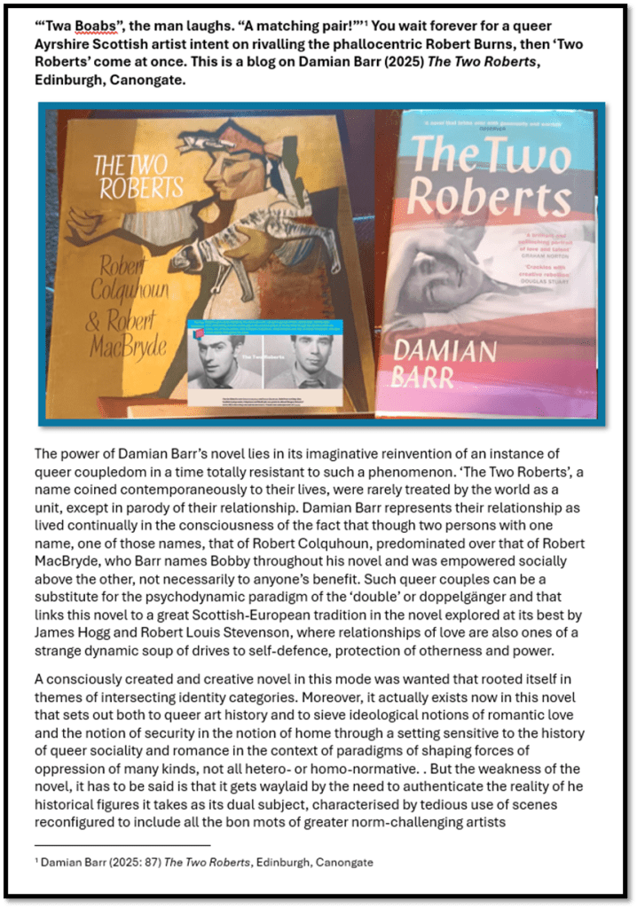 Today’s task ought to be why I want so much to do the blog I plan for tomorrow: the first draft of the start of which in Word I have screenshot above. I wince a bit that it feels necessary for me to pick up what in Damian Barr’s novel is weak in the second paragraph but I promise the rest will be laudatory (it just felt like it needed saying). The novel is about the queer artists, Robert MacBryde and Robert Colqhoun, who.lived as an open couple in London: open that is to sex with other men and known as queer amongst their friendship group and, accidentally, to a Colonel Blimp whose windows across the street on Bedford Street accessed sights in number 22, where the young men lived, and to sights Barr has describing as ‘orgies’.