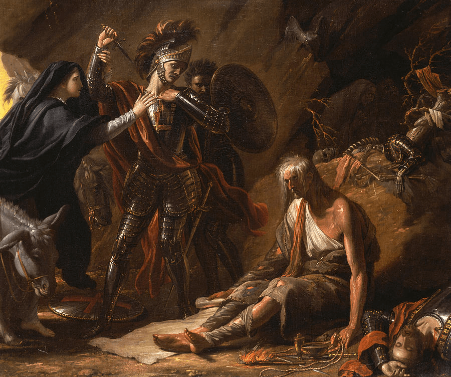 Trevisan, having escaped whilst his mate succumbs to the ‘rustie knife’, urges the Red-Cross Knight not to confront the cunning softly voiced Tempter but to flee. Suddenly, we see something more of what Despair represents as a character – he represents the art that lies in soft and soothing words offering a quick fix to doing your proper work in the world. Una believes that Red-Cross needs to confront such temptation, such art’, and Redcross complies: