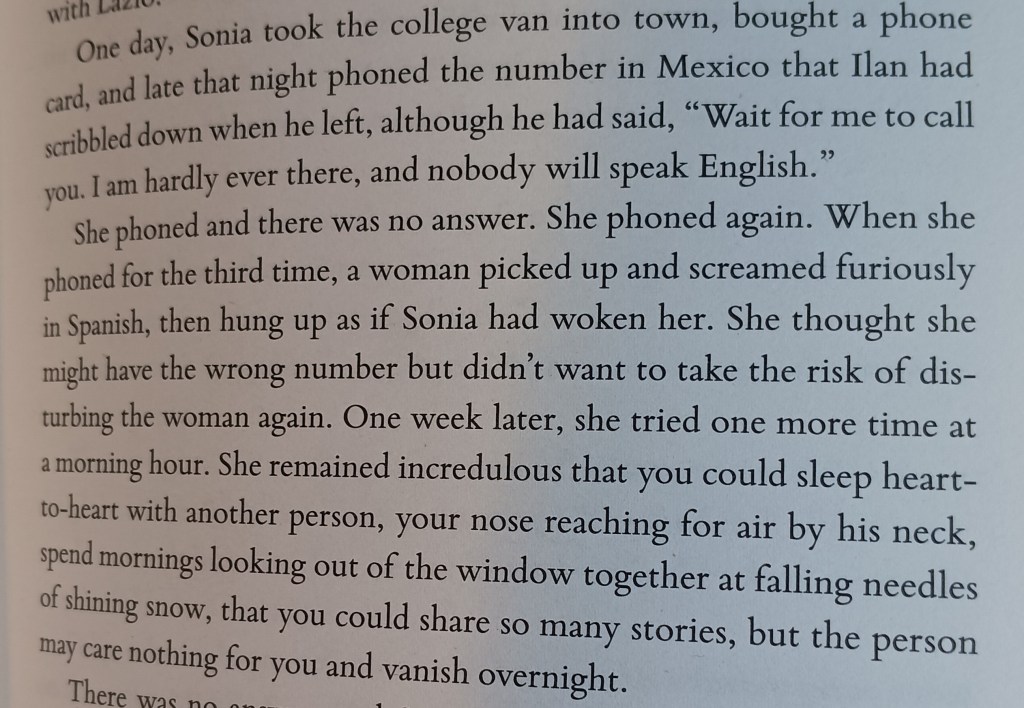 I am currently reading Kiran Desai’s The Loneliness of Sonia and Sunny. It is 700 pages long, so it will be some time before I am ready to blog. But I just read this at the end of a chapter. Sonia – horribly lonely, having been left over the winter at her college in the USA (Vermont) in the snow, a thing she has never seen or felt before, forms a relationship with an East European origin neurotic artist, Ilan, who goes away one day, leaving no easy contacts. We get this:
