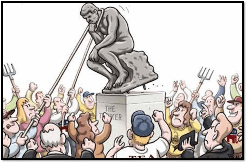 The cartoon representing The Republican Revolt perhaps best encapsulates my theme: the reception of a sense of The People, but as a conservative force feeling misled, and sometimes representing a whole class of past leaders which has already (mis)led the People, against its better judgement had it been asked, by force of possession of elite knowledge, skills and values – sometimes called ‘expertise’. The Thinker toppled represents a failure of thought that has wrongly felt a pull to practical questions which by virtue of its elite status it is unqualified to know about.