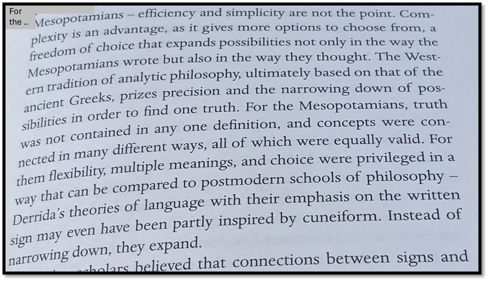 Her account of the library of Ashurbanipal and the role of its intellectuals – at one level ‘scribes’ of ancient text worth preserving, at another advisors both religious, social, and political – argues that the intellect and the complexities it forced to the attention of the powerful, and sifted to the people was just as complex as Derrida’s view of how to reward the world as text: