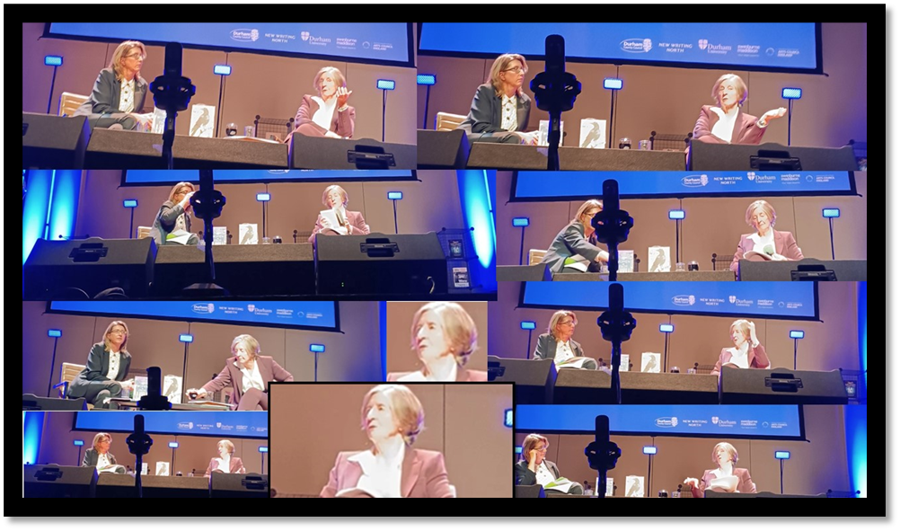 And then to the event with Pat Barker and Anna. A relaxed event where mother and daughter co-interviewed, for much was made of the difference in generation, and perhaps approach to art, as well as similarity, love and ownership of a common origination as writers, however separated its moments in time and history. See the collage of conversational poses and gestures below, for it gives a taste of the beautiful togetherness of mother and daughter.