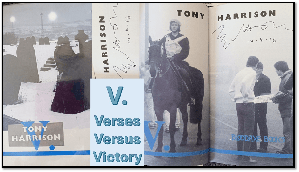 Photographs of my first edition (1985) of V, signed by Tony Harrison in 2016 on a visit to Teesside University for a reading. At the even, Andrew McMillan read from a copy signed by Harrison to Andrew’s dad, Ian McMillan, a well known Northern poet himself, and then gifted to son Andrew.