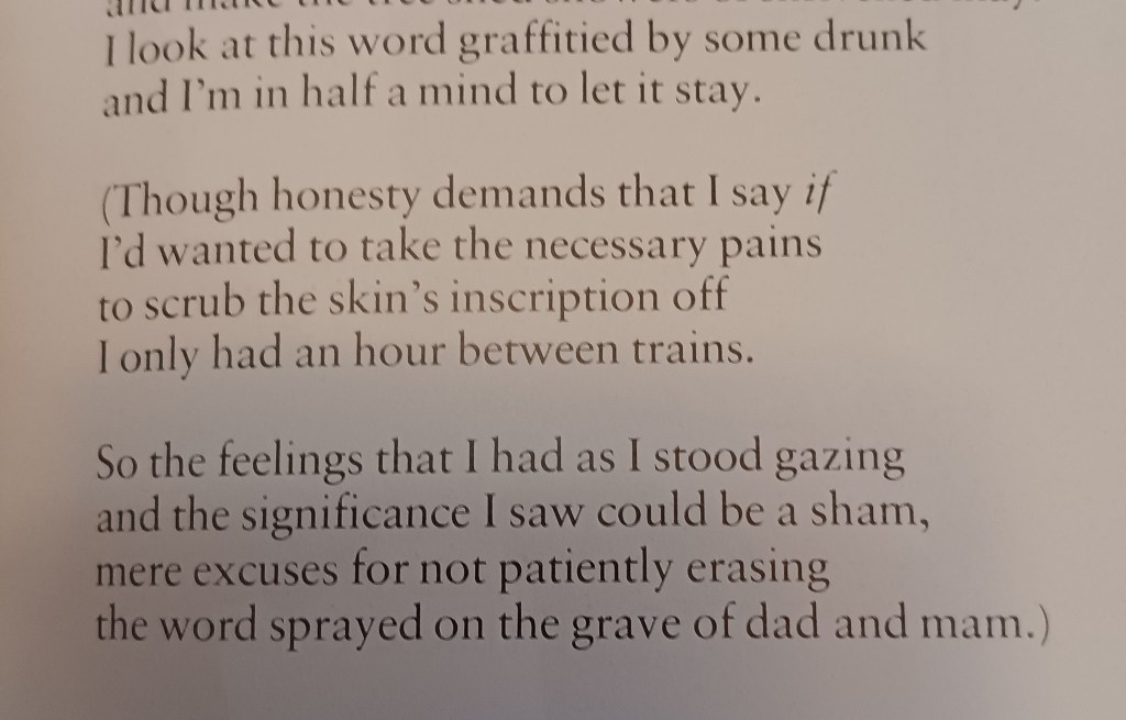 To rhyme ‘light’ with ‘write, next to a couplet rhyming ‘grave’ with ‘save’, hints of the death in life, Romantic poets attributed to their experience in the service of imagination at the expense of a truly lived life in the body and with other bodies, rather than imagined ones. Well that’s my fancy anyway. And it segues into a story told by Paul Farley, when he introduced his poem written in response to Tony Harrison’s V.