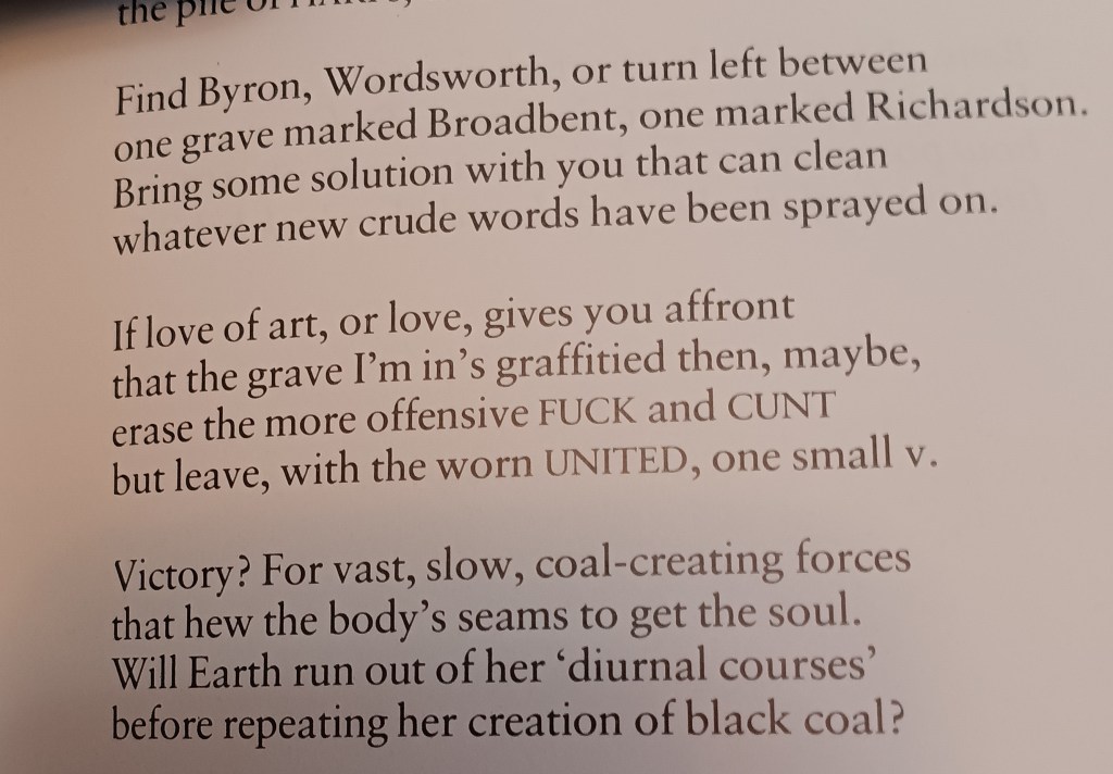 And when he does identify the place he will be buried, it is in awareness that he has achieved something greater than independence of his mum and dad, she still playing ‘Hamlet with’ him for his coarse obscenities that he calls poetry but a role in the modern pantheon, that he names, forgetting that the names are not those of poets Byron and Wordsworth, though signifying them here, but of Leeds bourgeois tradespeople no greater than ‘Broadbent’ or ‘Richardson’. And yet, as V morphs into the acronym for Victory, it is also the Vastnesses of the underground formation of coal for someone to dig it out again, only then to be thrown out of work as redundant. A poet learns he is not only less than geological forces, as Tennyson had, but of the human forces of an exploitative economy which produced the unemployed ‘skins’ Tony could have been, and imagines himself as in this poem, able to write only with a spray can, and unable to differentiate French from Greek, let alone translate Racine and Euripides as Harrison did.