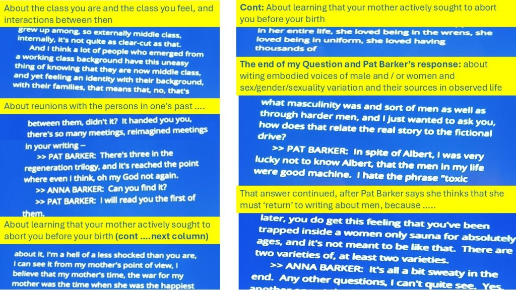 But these days, words said get transcribed (and very often mistranscribed to various effects) on screens behind speakers. So here are snippets – not always reliable. Pat Barker addresses class as if she were carrying on the conversation from the earlier event, where ‘knowing’ and ‘being’, the epistemology and ontology of if you like, being attributed to a class ‘status’ is made a problem, as it is for the characters in her fiction, from Billy Prior onwards.