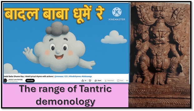 What a Dickensian way of introducing one’s emotional symbols is this, yet so subtle that when Ba, Sonia’s mother, consigns herself and her husband to solitude apart from each other, she chooses to live alone in Cloud Cottage. We should look out for clouds interred in the writing, but the main one is associated with the king of demons in the novel – the ‘faceless’ figure, with ‘cracked void, a broken visage’ instead) of Badal Baba, Hermit of the Cloud’, found by her grandfather in the Himalayas and given to Sonia as ‘protection’, or so she feels until she learns more about their nature. Search as I might I cannot find Badal Baba as the name of a Tantric demon or rakshasa but its meaning in Hindi is something like Dad (but instinct with respect and veneration as if for a spiritual teacher in Baba(बाबा )which it can also be) Cloud (babal (बादल) being cloud) and the only internet usage I found was for the Hindi rhyme explaining to children why clouds produce rain, useful knowledge for a country in which there is a monsoon season. Is Desai then being as playful with her ominous clod references as she is in describing Dadaji’s debt to Wordsworth’s cloud poem of loneliness.