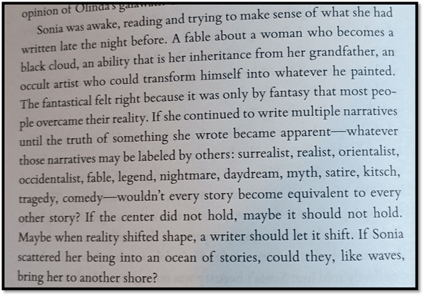 Later still, Sonia elaborates her own beast with its hunger for the ‘indispensable centre’ (James’ term) of the best stories in order to fragment them as a problem with fixing on a single narrative and even on a single genre of narrative types such that her writing is a beast too multiple – a ‘large, loose, baggy monster’ indeed, which even raids Yeats term for the missing centre: “If the center did not hold, maybe it should not hold’. But here she embraces the monster – no longer the demon-hound that emerges from and back into the sea, but the vastness of a central ocean of multiplicity – the modern deconstructed novel, or more appropriately the Indian diaspora novel since the innovations of Salman Rushdie.[11]