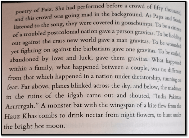 The idea that mulitiple things are one thing, in Neo-Platonism as well as some South-East Asian mystical paradigms, could be the key to finding a centre in a thing of multiplicity – a large, loose, baggy, monster – but the answer depends on the art of the past (pre-modernist but go back a very long way in India and Mexico via different paths to different phenomena) as well as that of post-modern doubts about singular and centred realities.You get another hint of that in the shade of another baggy monster – a ‘monster bat’ large and spooky enough to be a vampire or flying ghoul as Sonia andher father listen to a singer wearing a black sari to protest the morbid and deadly dictatorship of President Zia in a Pakistan of my memory:[15]