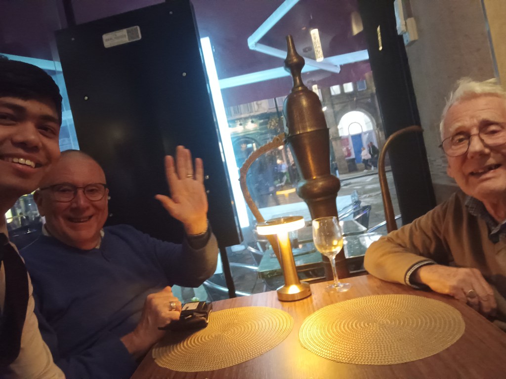If you had read the version on the 20th October of my blog on Punch, you would’ve seen that the new visit planned (to James Graham’s play Punch at the Apollo Theatre) was to be tonight, the 21st – but lo and behold, after dinner we got to the Apollo theatre on Shaftesbury Avenue to find I had mistakenly booked it for tomorrow night (the 22nd). Dinner, by the way, was at Charing Cross Road had been rushed unnecessarily. It was at the Marahraja, 19a Charing Cross Road. Here we are with our lovely host, Najeem, who took the picture. He was a wonderful waiter but is also a computer engineering student.