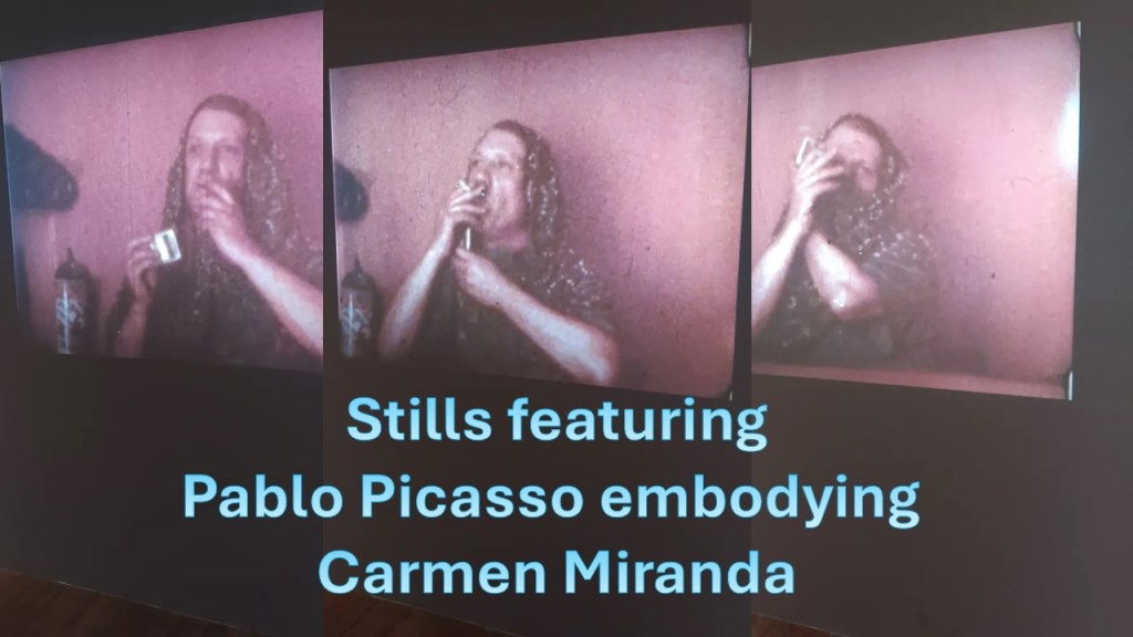 Within this context, we are to be persuaded that Picasso paintings and drawings are both reflexive showings of the process of making visual art and celebrations of the performative in every aspect of that which we call life and its representation. This is what remains to me from the exhibition, but I do not think the forceful effect they had in me owed a lot or anything to the makeshift nature of the institutional theatricalised and display contexts of the curation. If anything, it over-emphasised the viewers (see the collage above again) and had the effect not of making them participants but of dulling down the imaginative processes (and these are not elitist as people sometimes imagine – they just require a certain attention of the gaze so the stillness may speak and move as making processes are recovered by the viewer) required to see the dynamism of Picasso’s art. There are many points, very intelligently made, about the idea of what the performative is in the curators’ words in the catalogue – few of these however were really animated by the art of the curation as I had hoped – except for the blindingly obvious – in the showing of films of Picasso in self-performance, as a drawing artist (the inevitable wonderful film Mystery of Picasso – I have a DVD at home – which at the exhibition was animated before an audience setting of tiered benches) or, below, in stills with Picasso at play as Carmen Miranda – an excerpt shown on entry to the exhibition: