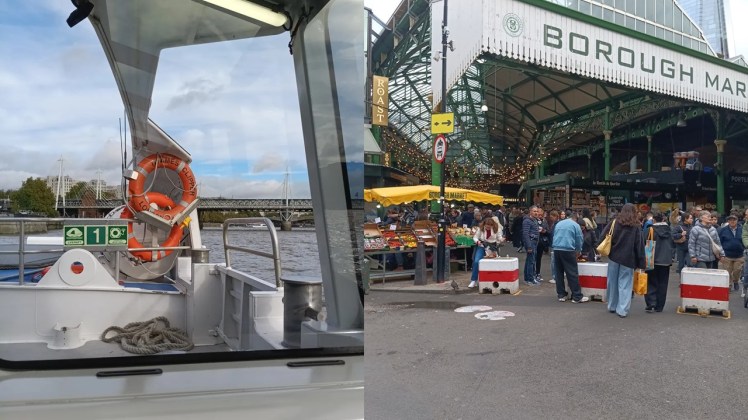 With time to spare before our tickets were operative for the Picasso exhibition, we wandered around Borough Market. But as I looked at the evidential photographs, I noticed that even the most unskilled of photographer (myself) cannot help but capture through a photograph what makes the known world feel unknow. below the scene of the river ahead on the boat carries reflections on the surface of glass and metals that change the spatial scene and so reconfigure it, that anything can seem not quite itself but a world of images alone, and even the light on the curvature of Borough market curved ceilings have an estranged appearance.