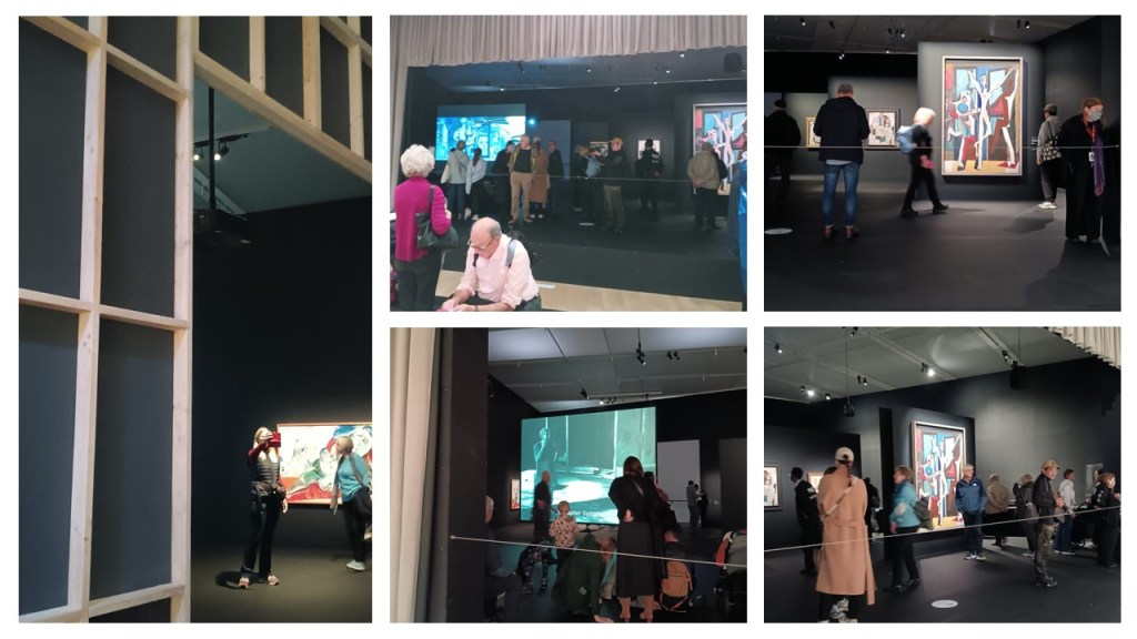 As a result, anything we see in the Theatre Picasso exhibition has to be put into the visual context of theatre, without being in a theatre at all, for theatre is also a metaphor for any display or performance. That basic metaphor of what all representation is – that is, it is ‘performance’ – has to be created in very obviously faked theatre scenes featuring the backs of scenic flats, the display furniture of the archives of great collections, prosceniums and faked art gallery walls. I took some pictures of that aspect of the show that appear in the collage below. These pictures may register my feeling that all of this is far too obviously the equivalent of a rather over-enlarged childhood theatre toy. This aspect of the show felt rather tedious to me after the first instance of it has been seen, such as the two levels of the gallery joined by a ramp corridor which divide the visitors to the exhibition into a participant of the spectacle of the show and the viewer of that spectacle in which they now realise they have taken part.