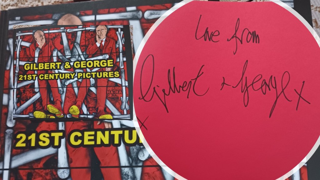 At this point, Geoff and I can now safely leave the exhibition – disappointed in the hubris of its curation, whilst still aware of the subtle re-seeing of Picasso’s art it intended and went a little way to uncover. We plodded home along the Southbank until cutting back to our hotel over Lambeth Palace Park. But before this, we nipped into the Hayward Gallery to buy a copy of the weighty catalogue for the Gilbert and George exhibition that we were to see the next day. I am glad we did because only a few of the signed copies were left.