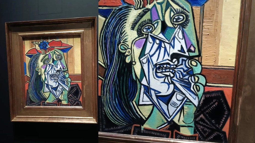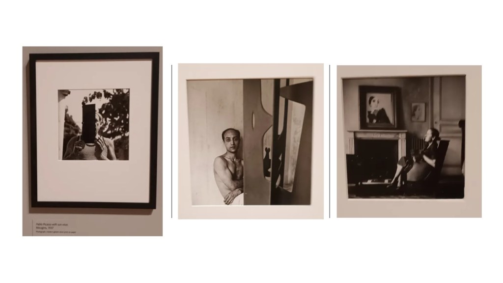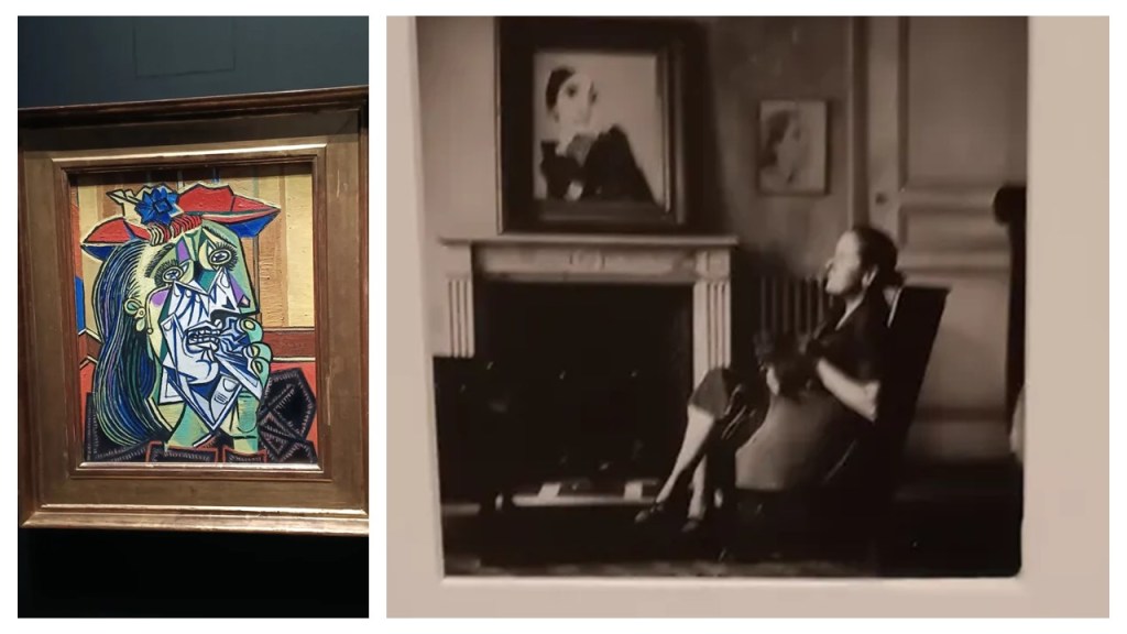 Strangely enough, Lee Miller’s photograph of Dora Maar sitting with one of Picasso’s other portraits of Dora seemed relevant to me here. It would be more so if the portrait been The Weeping Woman (left in the collage), for her stillness with only semi-gaze on her alter ego would show the picture’s independent restlessness and dynamism.