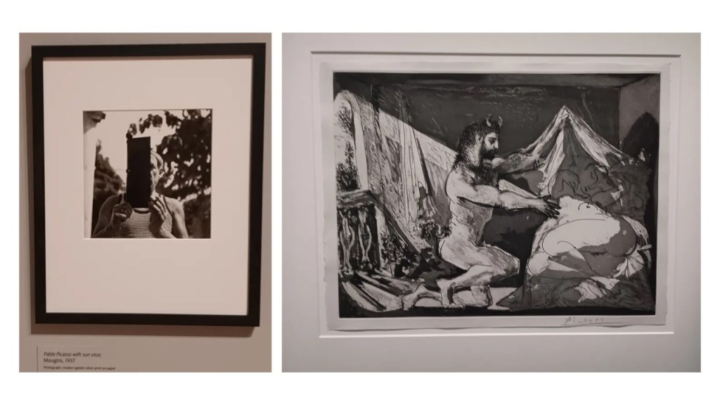 That point seems also to be hinted at in a Lee Miller photograph of Picasso, where he uses his hands to manipulate access to his face by using a sun-screen to semi-obscure it. It ‘reflects’ the way in which the classical drawing I have collaged with it plays with desired reflection of male and female figures. The overly athletic minotaur-bull-man, the very opposite of Picasso’s own figure as a man, pulls apart the veils covering over the female figure he desires but sketches in so lightly. Are the curators right then to suggest that their recovered extract of Picasso playing Carmen Miranda makes clear his view of the performative nature of sex/gender in art.