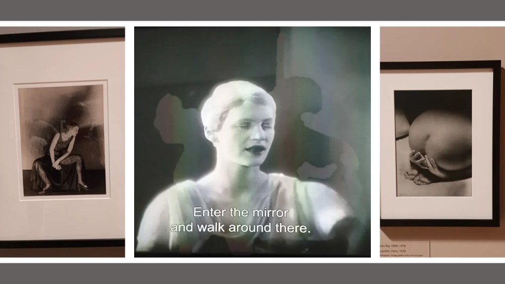Surrealism was always a movement with contested meanings – sometimes it looked to exploit the quality of being a representation ‘above’ or ‘over’ realism to question the stability of the relationship between things and their given names, or explore their nature of dream-like association to things which destabilised our sense of comfort in naming or describing them. Sometimes it insisted that we need to look squarely at things we thought we knew about and re-know them. At first Man Ray’s images of Lee seem to absorb her into his world – one where he question the meanings of her appearance in the world ,- as a beautiful woman for instanced is reduced to ‘parts’ of herself, and in unusual juxtapositions of those parts, such as that of the hands and anus in the third picture in the collage below, or by projecting onto and into her a shadow world not surely only hers but his but maybe only partly so hers. Just as in the use of moving images of her body as that emergent from the point where a Greek statue of Athena comes to life in Cocteau’s use of her in film makes her still an object of surrealist attention rather than its subject – a product of its metamorphoses of things by revisioning them from within the artistic gaze. Even her words make her a ‘portal’ (‘Enter the mirror and walk around there’) to their (not her) surrealist project. But to see that piece of film also shows that Ray’s and Cocteau’s view of Lee made her the object of enchantment not the producer of it as an independent female vision: