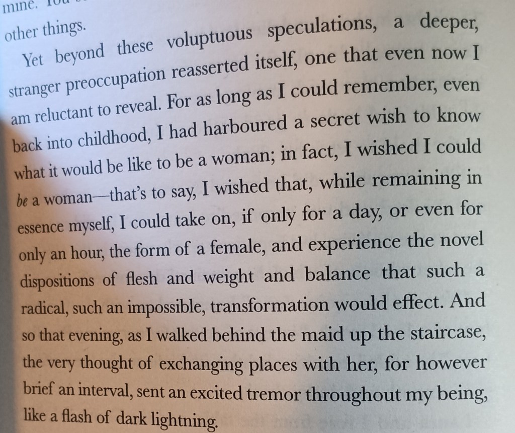 However you spin it, this goes well beyond clothes fetishism and a liking for the feelnof silk, whilst being intrinsically linked to the imagined and remembered feel of clothing associated with women: ‘the novel dispositions of flesh and weight and balance that such a radical, such an impossible, transformation would effect’. The man desires not to look and feel like a woman might, but to ‘be’ a woman, a thing he thinks ‘impossible’ but desirous. Whether the i.possibility is biological or a thing of social convention is never decided but, elsewhere in the nov, in his identification with Cesca Ransome for instance, it seems of the order of the wild against the tamed binary, the becoming of an ‘some exotic creature of the wild’ and ‘enclosed in a cage’: [7]