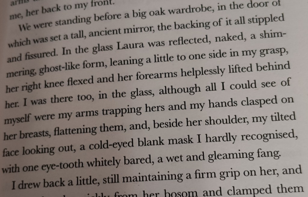 Such appearances in such mirrors can be deceptive. However, isn’t it always the case that things that are meant to reproduce a likeness actually just as often reproduce an ideologically or emotionally tinged interpretation different to its assumed original. This is true throughout the novel, where nothing is either as it seems or as it is described. Victims become perpetrators of the crime of which they were victim, sexual delight in what is described as a special or ideal form becomes confused with mere likeness of naked function, when the Evelyn is unveiled to replace his wife in bed with not one but two women, who also share sexual love with each other. A cathedral, St Mark’s Basilica, is ‘like’ a giant threatening spider.