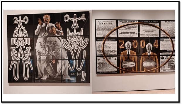 The Stroop effect is the name given to by experimental cognitive psychology to the delay caused in processing incongruent stimuli – the classic example of such stimuli being the name of a colour that is coloured-in with a different colour than that named. In this piece the word BLACK is coloured in green whilst the word WHITE is coloured in white. Whether the Stroop effect is referenced here or not, the incongruence effects will subconsciously effect the processing of the marks here. In relation to Stroop perhaps we mightIn the end I retreat to feeling that the artists have no ‘meaning’ other than the incoherence and more often incongruence of messages that are confronted in such contradictory forms in order to overwhelm the viewer who looks for the comfort of a single meaning. The most difficult of works to process is, in my view, the panel called WHITE BASTARDS in which racial slurs are inverted and reinverted in line with the process of interpretation in which we see the title as an ironic inversion of the more-often-used racist term BLACK BASTARDS, or as an imagination of white vulnerability that disturbs the reality of a culture in which whiteness is privileged. Let me leave my analysis at that.