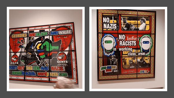 The two pictures work entirely differently. Gents puzzles immediately by being framed by a circumnavigation of directions signs to the Gents public lavatories, whilst internally being a fractured and burst explosion of colour, within the frame of a symbol that was that of the SMASH THE NATIONAL FRONT, where a militant fist shatters a swastika, but never so as in such an engaged and violent manner as this. The medallion worn by Gilbert under his collar is, in a manner that rhymes with other left-wing symbolism here with the ‘BLACK AND WHITE UNITE’ hands. But this rhyming also contradicts other messages – the ‘GENTS’ signs are themselves black characters, including the symbol of a man, on a white background. The upper register of the work has the vertical black and white stripes of the Newcastle-Upon-Tyne football team, to which the legend refers: ‘GEORDIES ARE BLACK AND WHITE’.