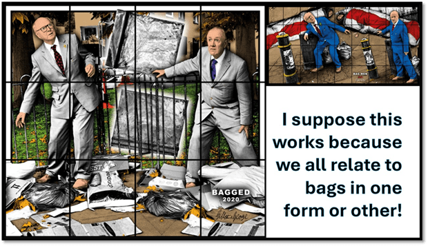 Often the incongruence relates to words that exploit not only ambiguous meanings but ones that have opposed associative meaning in different cultural uses of language, as we shall see when we look at the BEARD pictures, but the word and icon BAG also has this resonance, as in the collage of pictures from the New Normal Pictures below which associate black rubbish bags, drug ‘baggies (of heroin usually), sleeping bags and military body bags in disturbing incongruence of meaning and association.