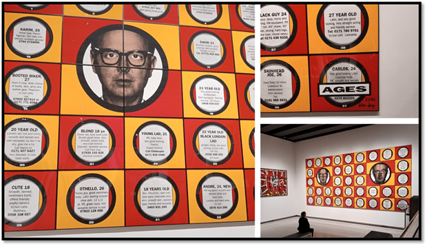 Is George being ironic. In The New Horny Pictures of 2004, in a piece called Ages, is a display of messages in which young men between 18 and 28 (or so they say) advertising themselves for male-on-male sex. The icons of Gilbert and George are set in circles with a quadripartite square, such that the intersection of its internal square boundaries appear like a gun sighting device trained on their face. What are the ethical issues here? Is violence against the queer acknowledged – then whose feelings animate the targeted potentially violent feelings. In many ways the piece animates my own ambivalences about the sex-trade that feeds on youth. Just as the piece Slugged self-slimes the artists.