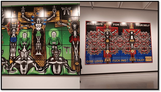 These pictures exploit the many meanings of beard – hair that is not misnamed if named as pubic (for it relates to male puberty) hair and sometimes used to refer to the cover of manliness used by queer men to hide in public situations – such as the fake girlfriends and wives of queer film stars, such as Rock Hudson, who were called beards. In this picture the beards are not only long and pendulous but also stroked by the figures representing Gibert & George. Within them is a chaos of coloured part figures – male busts from coins, as well as near organic forms. Near the tail end of each beard are advertisements for Condoms and the ‘Big Gay 10K’, some kind of queer fortune-telling website. These beards, and this and in “Sin” Sational are nearer to being phalluses than other beards in this set try to be. Much as I look for redemptive positive meanings about queer lifestyles in these, I find them – and I think this is because such ‘positive meanings’ were always considered to be more like the dogma of a religious ideology than about the representation of the ethical issues in queer lives – as difficult as those in any other lives.