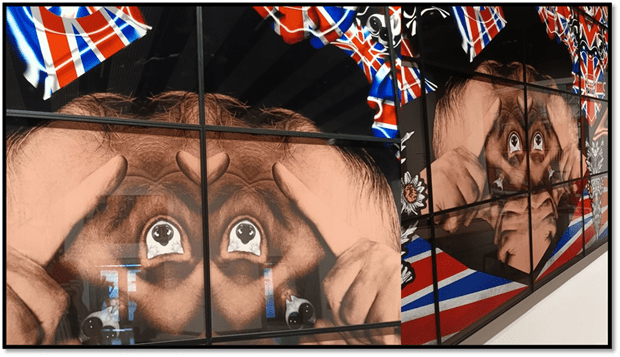 The artist’s hankering after Union Jack flag waving is also complicated with ways of welding images together that deliberatelt associate it with the faked sexual – see for instance how the inversions of facial imagery from the artiststhemselves is turned it shapesthat look queer and sexual.
