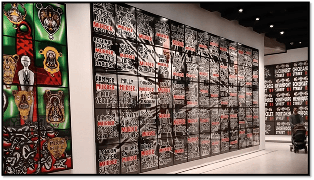 Others use panels to dissect a concept -the relation of crimes against queer men and an association of the streets of East London with public lice that Keep you gazing for hours and never finding anything definitive in them, although Geoff and Claire say to me that the implied narrative of queer murder wall has a political narrative that puts Gilbert and George on the soide of us as activists. I believe them.