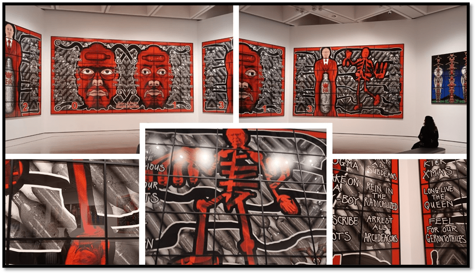 What might Gilbert & George mean when they said in 1986 in What Our Art Means (and republished by them in the catalogue of this exhibition in 2025) that it is intended ‘to speak across the barriers of knowledge directly to People about their Life, and not about their knowledge of art’.[1] This blog documents reflection on a visit, and reading afterwards about, Gilbert & George: 21st Century Pictures in the London South Bank, The Hayward Gallery on 22nd October 2025 at 10.30 a.m.