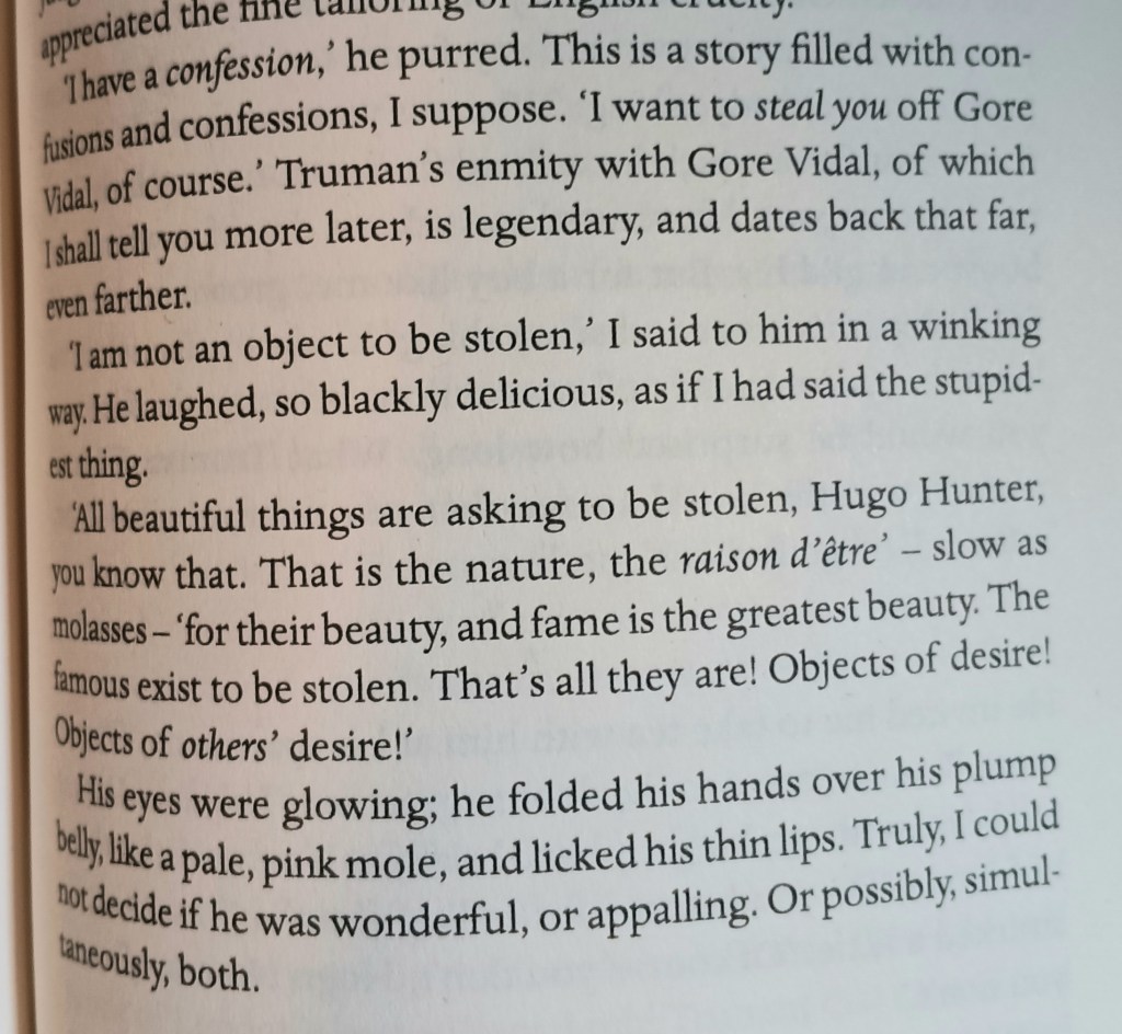 I think also that Blakemore has more to say on this in his choice of Truman Capote as an important voice in showing how damaged queer people can be by life – a process of harm to young queer kids now continuing again more fully than before in the UK. There is a great ethical principle in the section below that references Helen of Troy about the fact that ‘objectification’ is a process queer people might have escaped had not queer desire been confused with the appearance value of fame, as if fame were beauty – not that which enters your heart silently.[8]