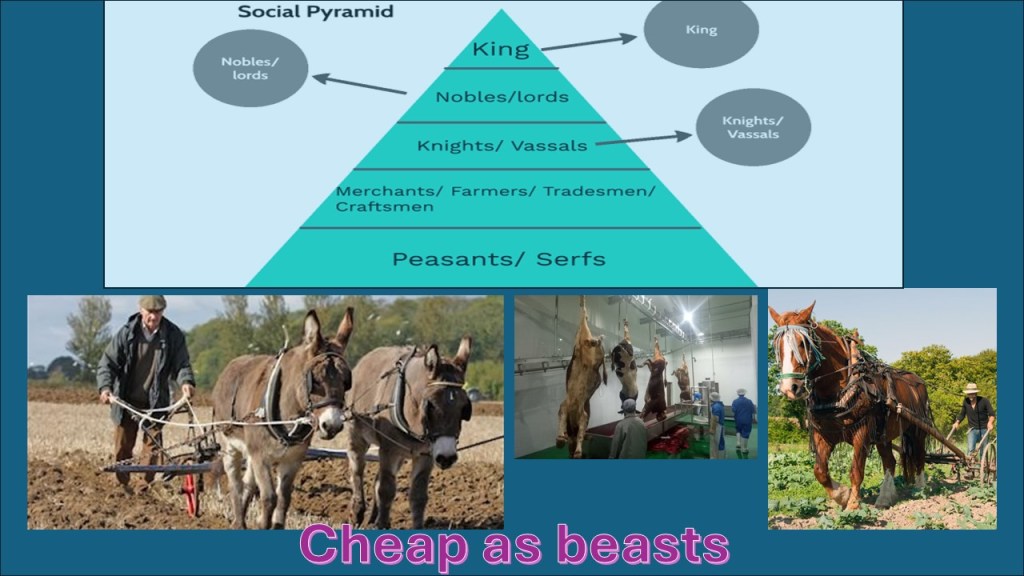 We ought not still be asking students to look for animal imagery in poetry, for in this case, animals are used discursively to create a symbolic hierarchy of value, that runs from the wealthy – kings and ladies (ladies being a class term), down to the ‘basest beggar, except that there is a base even below the lowliest beggar – animals. Animals are the living beings of nature, Lear implies, and humans are worth more than nature precisely because they possess that which in nature is superfluous. It all comes down to this. In the end, we humans are deserving of more respect and moral value than no-human animals because we can, unlike them, possess things we do not need and use them as a measure of our power. It is reducible to exchange value – the value of man and beast are compared in terms of their relative cost, from dear to cheap.