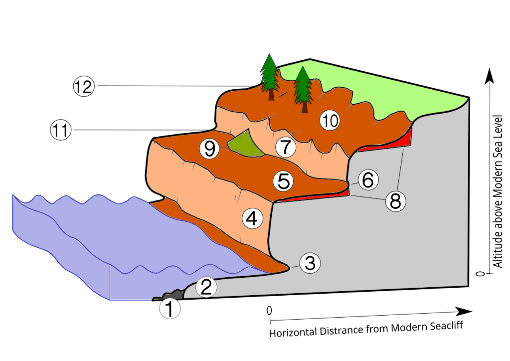 But as the diagram from Wikipedia on raised beaches show, one person’s beach feature is another mountain plateau. How much more the case when we consider that from the bottom of the ocean, raised beaches are little different from steps out of the ocean for the Kraken once it wakes. Consider, for instance, the low-tide cliff or ramp (number 1 in the diagram), which shows that erosional formation of geological features continues downwards – perhaps to the abyssal plain. .