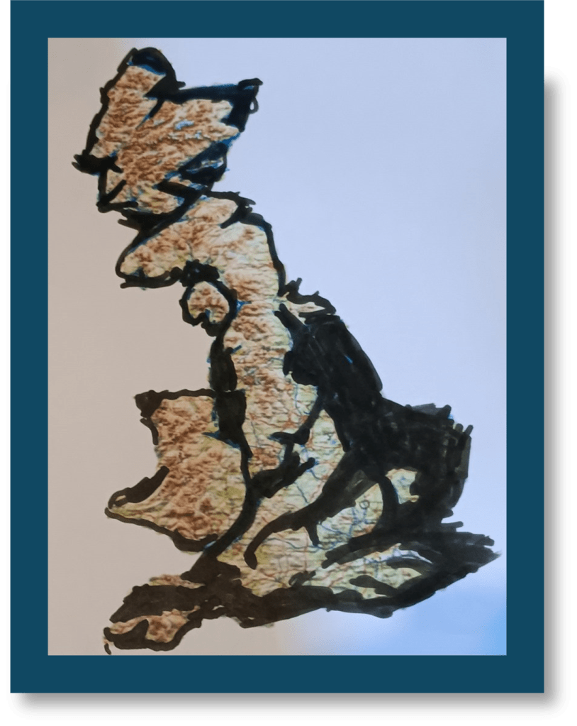 And here we have to explain, what only becomes clear as we read on in the novel, that the world of nations of his time-frame , starting May 2119, is one where most places, though the nations themselves seem to have survived as federated island-states, we know of as the countries of modern Europe are now archipelagos, in which in the modern Cotswold Island, Marlborough has become a thriving port serving the Vale of Oxford Sea named Port Marlborough. Great lowland cities like Oxford, London, Edinburgh and Glasgow are now under water. To aid my imagination I tried to fill in the lowlands on a map of the UK in black and blue ink. My faulty version is below, but it gives a vague idea of a time-and-place-frame, for this is how we have to imagine space and time in this novel, for that phenomenon is voiced in several discourses.