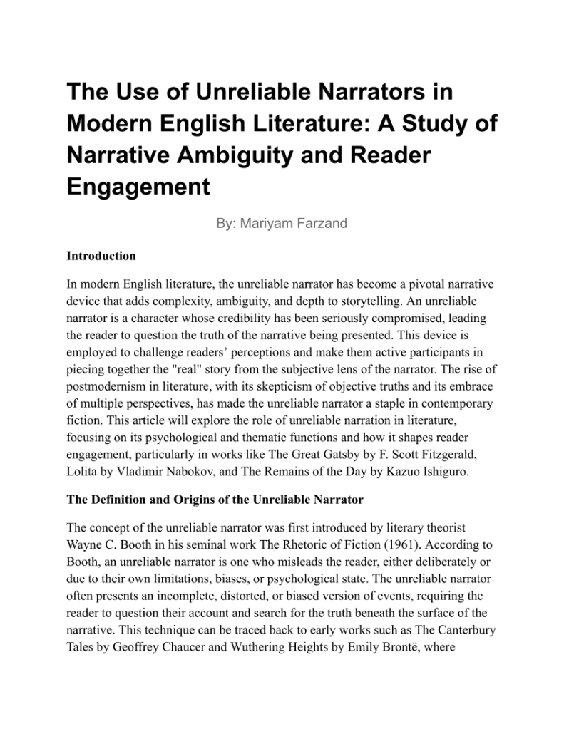 Likewise McEwan, as a master of the novelist’s craft, uses deliberately deranged materials. Metcalfe and the equally important narrator in Part Two, who arranges and deranges the Part One stories very differently, in this novel are examples of the classic element in novelistic storytelling, the unreliable narrator, as described by Farzand below: